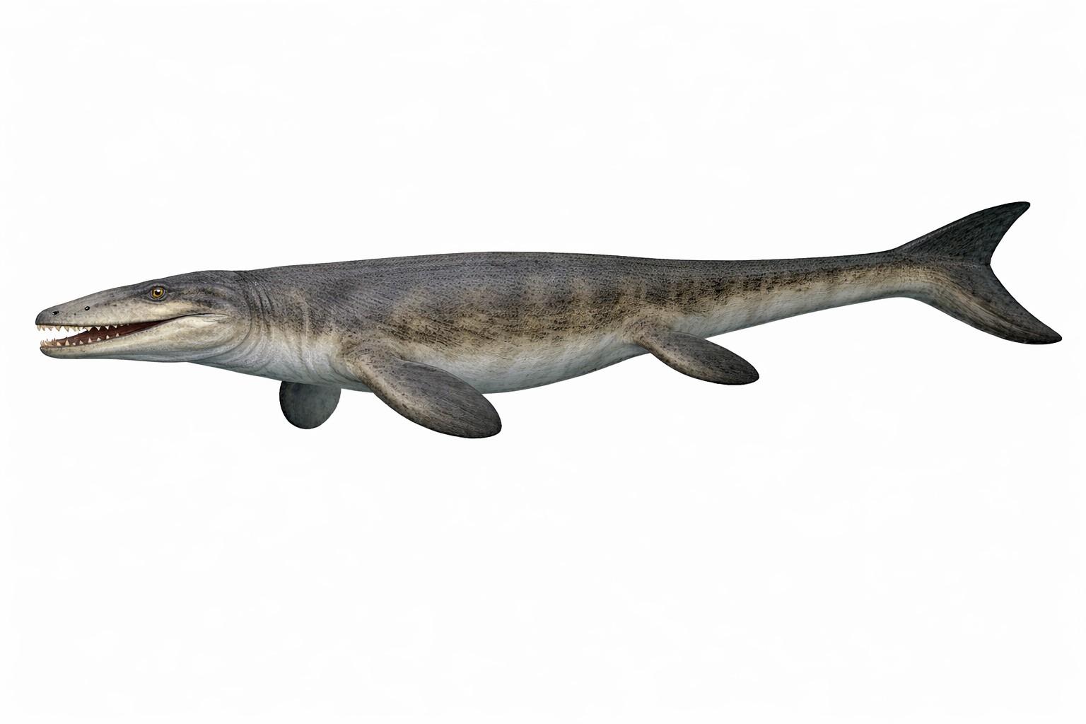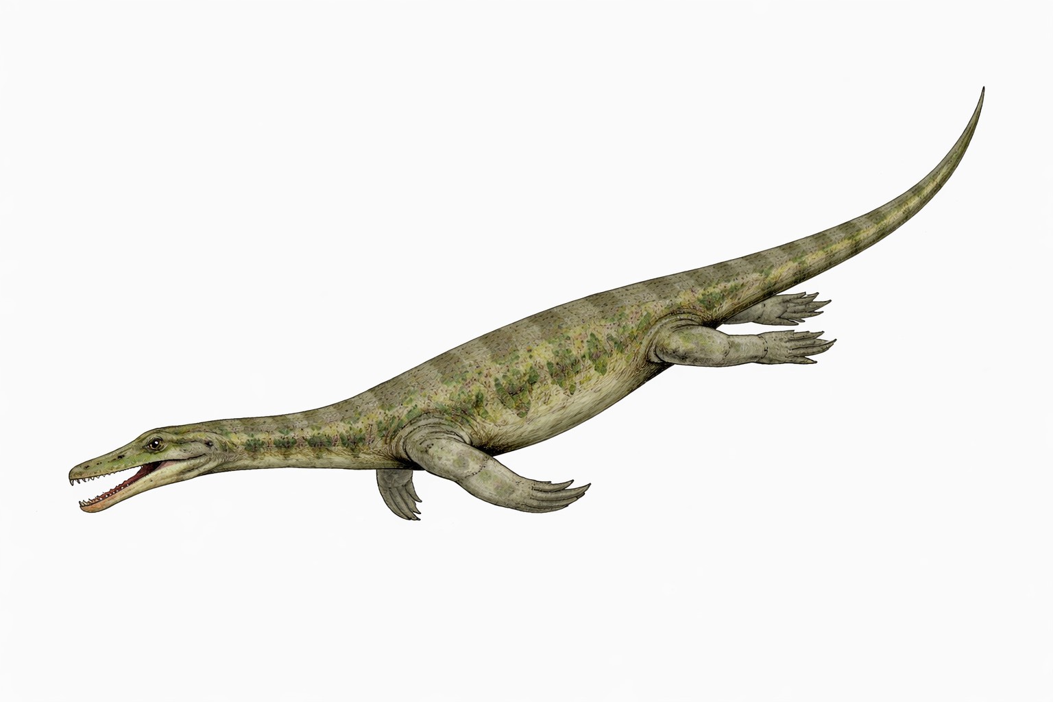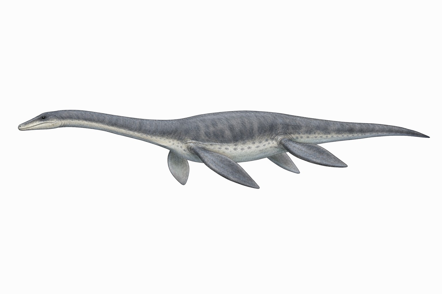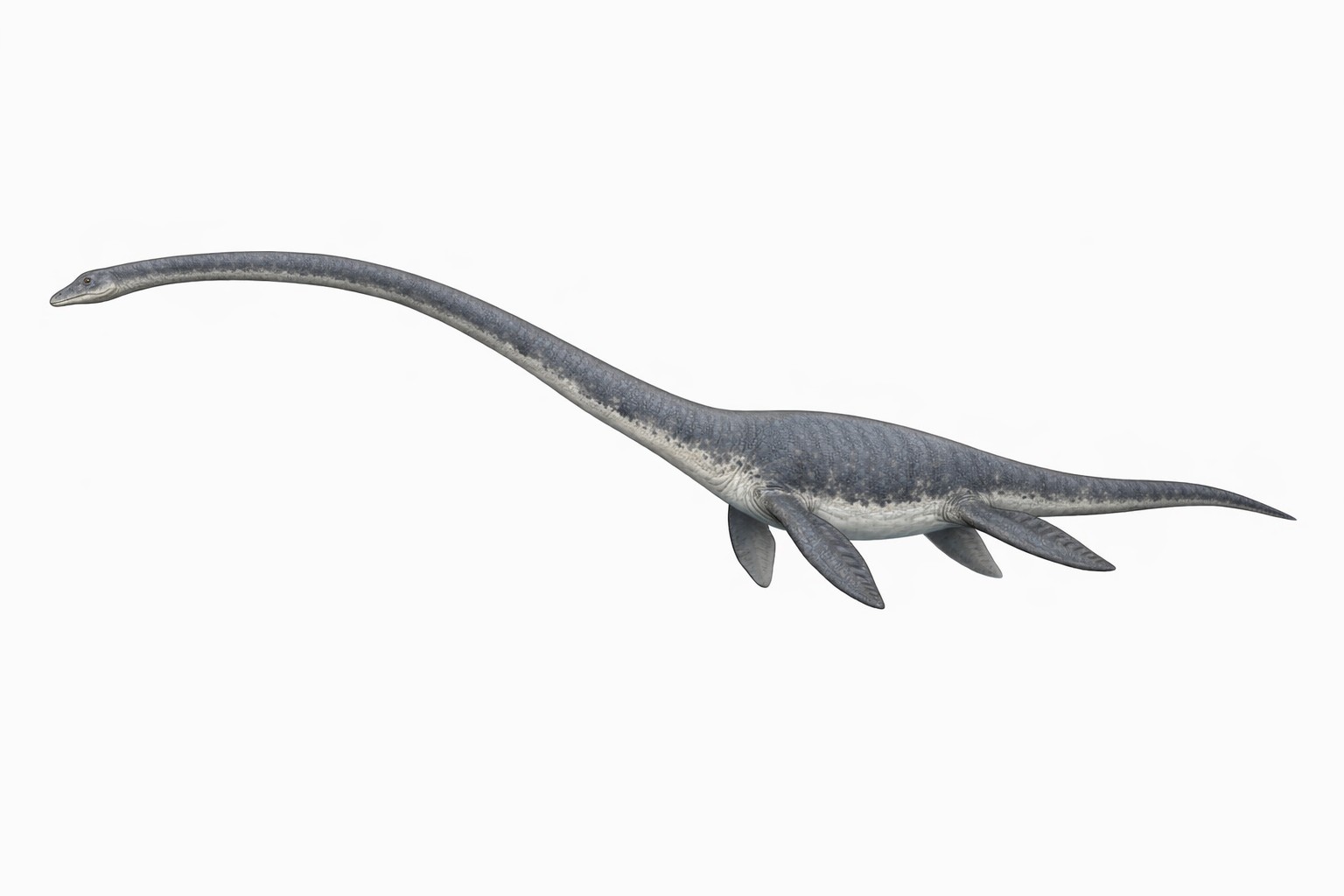 بليسيوصورس أيقونة الزواحف البحرية الجوراسية؛ زاحف بحري بعنق طويل يبلغ 3.5 متراً، اكتشفته ماري آنينج عام 1823 في إنجلترا، وأصبح إلهاماً لأسطورة وحش بحيرة نيس.