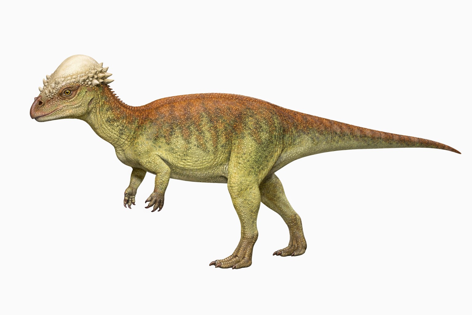 باكيسيفالوصورس السحلية ذات الرأس الغليظ من طباشيري أمريكا الشمالية؛ ديناصور طوله 4.5 متر بقبة جمجمة سماكتها 25 سنتيمتراً، أثارت فرضية التناطح العلمي الشهيرة.