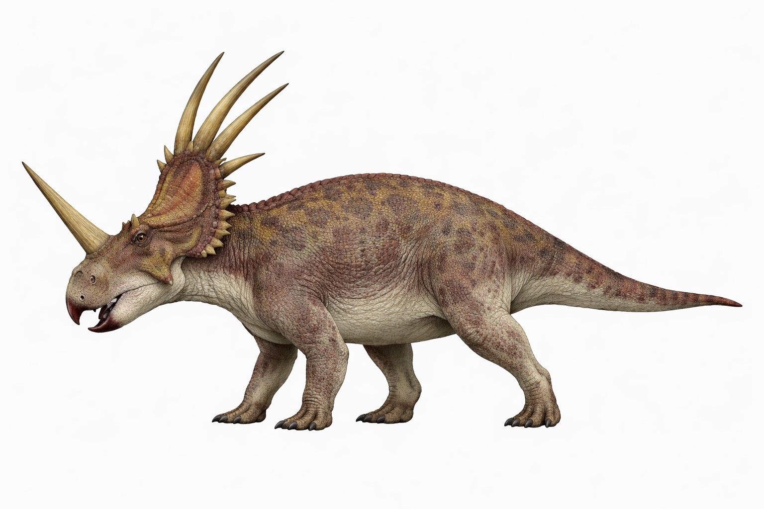 ستيراكوصورس السحلية المشوّكة من طباشيري ألبرتا الكندية؛ سيراتوبسي طوله 5.5 متر بقرن أنفي 60 سم وستة أشواك ضخمة على درعه، من أجمل الديناصورات المقرّنة إطاراً بصرياً.