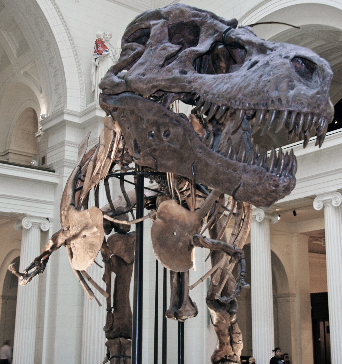 تيرانوصورس ركس (Tyrannosaurus rex) أحد أضخم الديناصورات اللاحمة التي عاشت على وجه الأرض عبر التاريخ الجيولوجي. امتلك هذا المفترس الهائل جسماً بلغ طوله حتى 13 متراً، وارتفع عند الحوض نحو أربعة أمتار، فيما وصلت كتلته إلى نحو 8.8 طن. كان يسير على قدمين خلفيتين قويتين ضخمتين، وكان ذيله الطويل والثقيل يوازن رأسه الضخم. أما أذرعه الأمامية فكانت قصيرة بشكل لافت قياساً بحجم جسمه، وتنتهي بمخلبين فحسب، غير أن العلماء يؤكدون أنها كانت بالغة القوة بالنسبة لحجمها الصغير. كان يمتلك جمجمة ضخمة بلغ طولها قرابة متر ونصف، تضم ستين سناً حادة يصل طول السن الواحدة إلى 20 سنتيمتراً، وهي مقوّسة نحو الداخل لتشبك الفريسة وتمنعها من الإفلات. أثبتت الدراسات أن قوة عضّته تجاوزت ثلاثة أضعاف قوة عضة الأسد، مما يجعله صاحب أشد قوى العض بين الحيوانات البرية المعروفة عبر التاريخ.